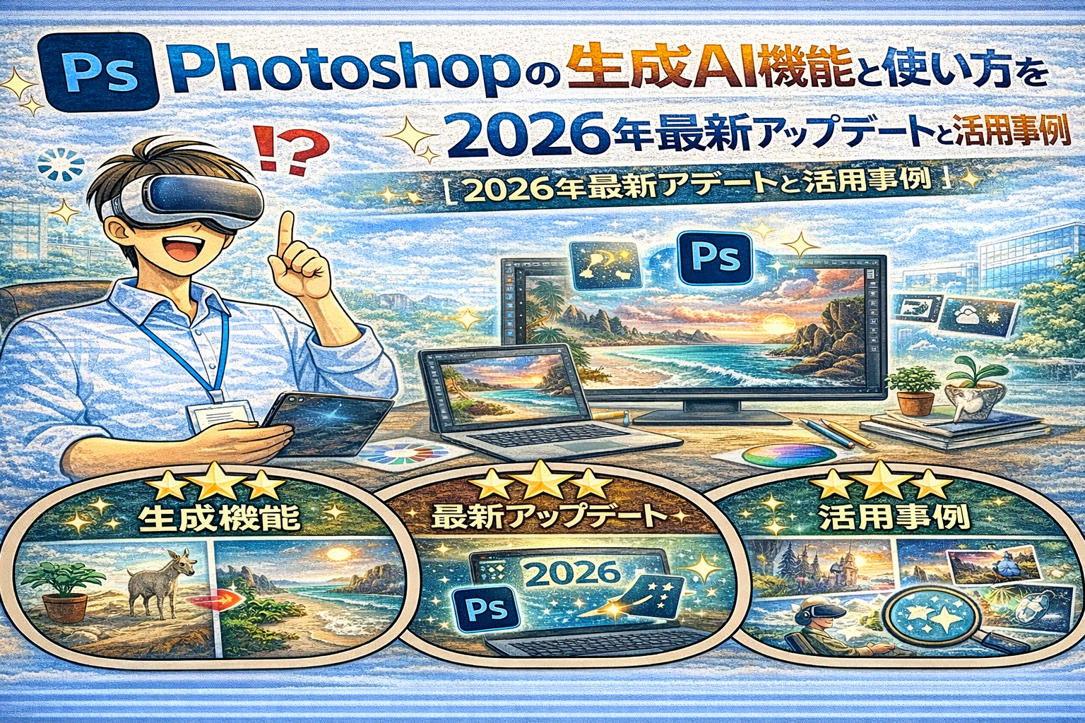 Photoshop 2026の生成AIは、画像編集を大幅に効率化する最新テクノロジーです。生成塗りつぶしや拡張、調和、アップスケールなど、多彩な機能が搭載されており、写真やイラスト制作、Webデザインなど幅広い分野で活用できます。下記では主な機能の特徴や使い方、活用例を詳しく解説します。
